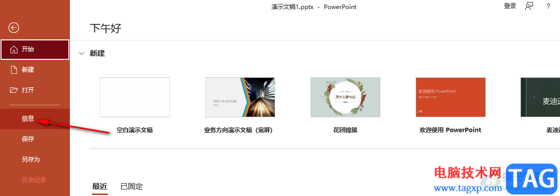 3、第三步,进入文件页面之后,我们在该页面的左侧列表中找到“信息”选项,点击打开该选项