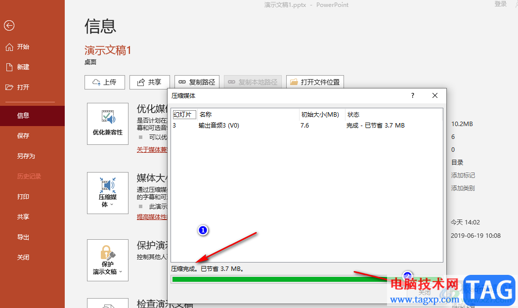 4、第四步,打开信息选项之后,我们在信息页面中找到“压缩媒体”选项,点击该选项,然后在下拉列表中选择一个自己需要的压缩方式