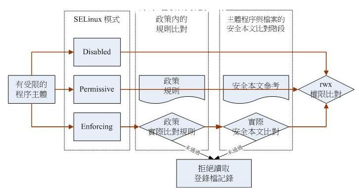 SELinux(Security Enhanced Linux),以下是SELinux的三种类型实际操作流程示意图: