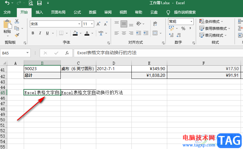5、第五步,除了在对齐页面中勾选“自动换行”选项之外,我们点击单元格之后,在“开始”的子工具栏中找到“自动换行”工具,直接点击该工具即可