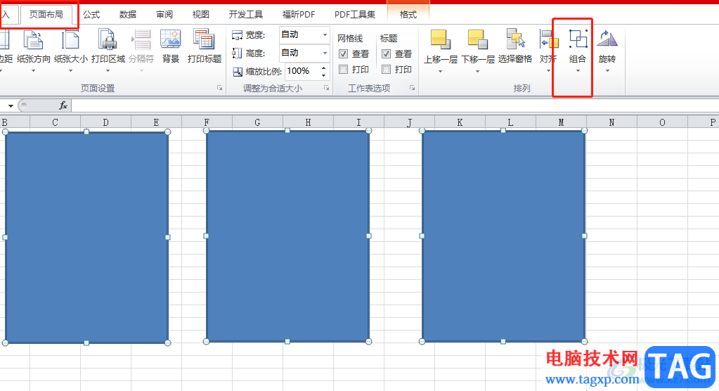 4.接着需要用户在表格页面上绘制出一个矩形,并复制粘贴出两个矩形,用户按下ctrl键将其全选中后直接点击菜单栏中的页面布局选项,并在显示出来的选项卡中点击组合选项