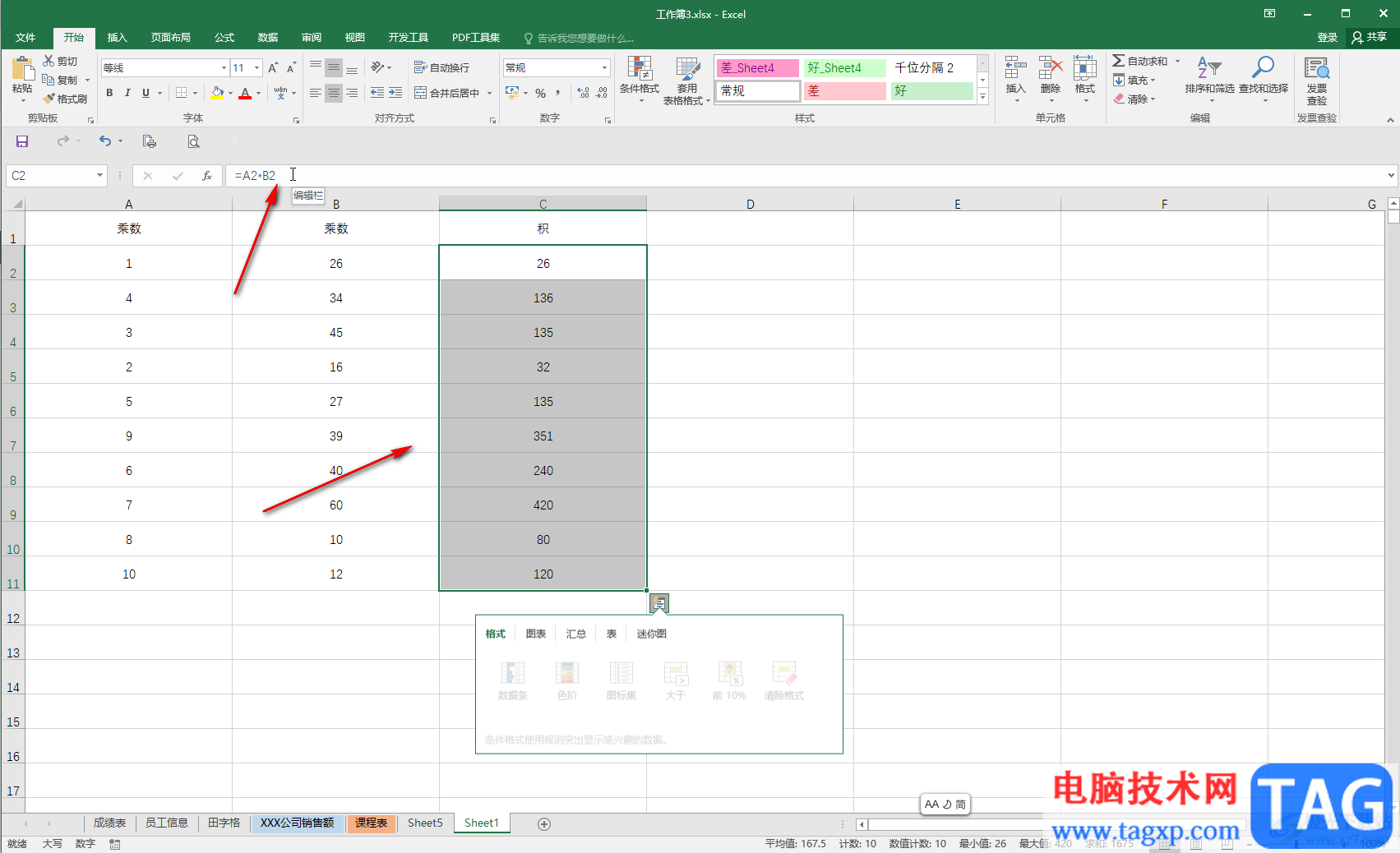 第一步:双击打开Excel表格,可以看到C2单元格的计算结果是A2*B2的结果(只需要在英文输入法下输入=然后点击一下A2单元格,输入乘号*然后在点击一下B2单元格,按enter键就可以得到结果了;