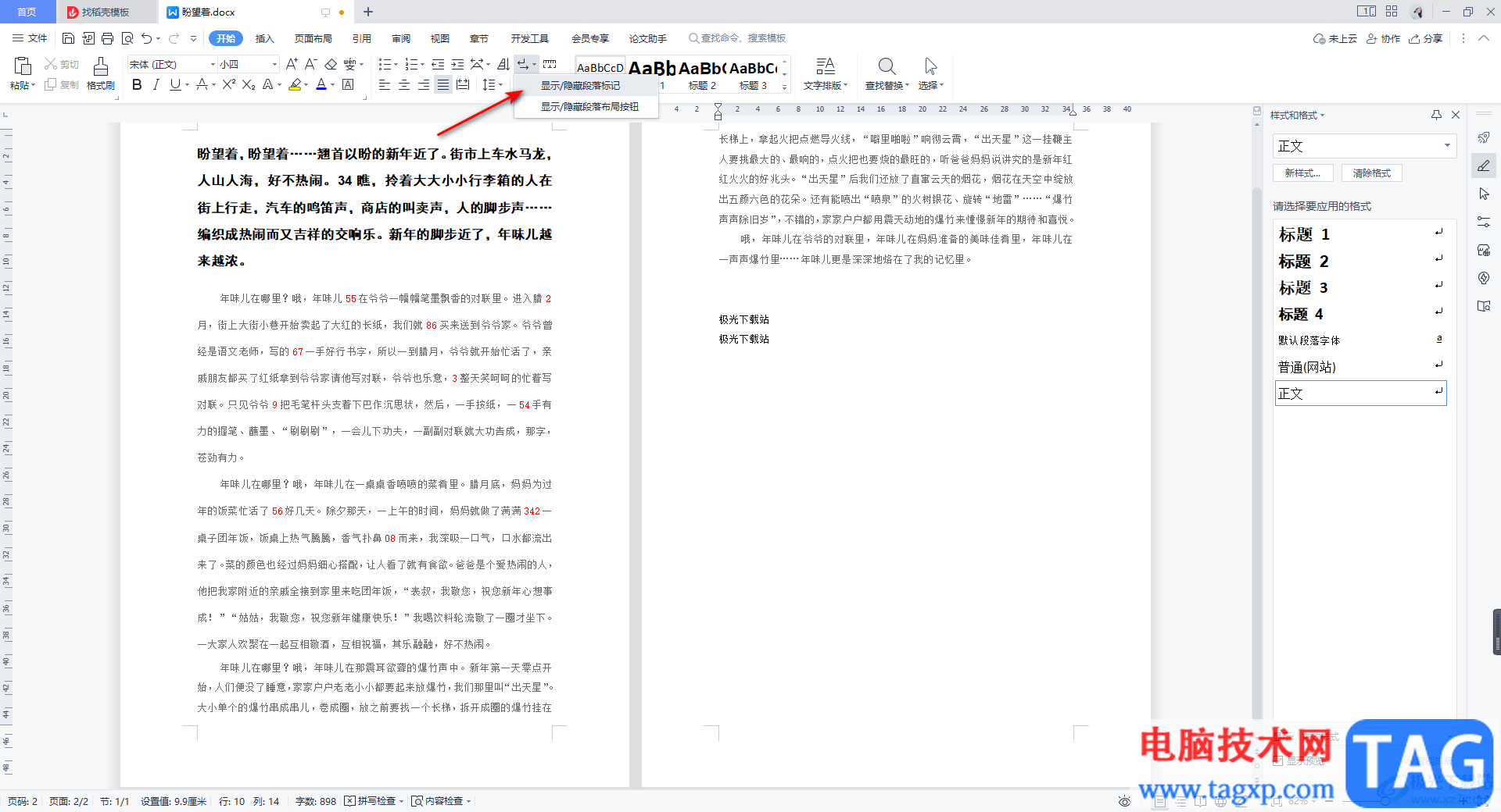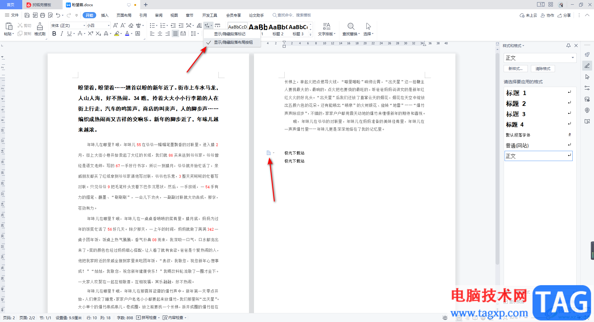 3.将段落工具栏中的【显示/隐藏编辑标记】这个选项找到,并且将该选项功能点击打开,可以看到有两个选项。