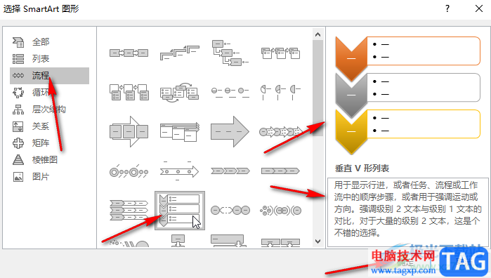 以上就是PowerPoint演示文稿中制作流程图的方法教程的全部内容了。在窗口我们还可以点击切换到“列表,循环层次结构,关系,矩阵,棱锥图,图片”等栏中进行详细的设置。