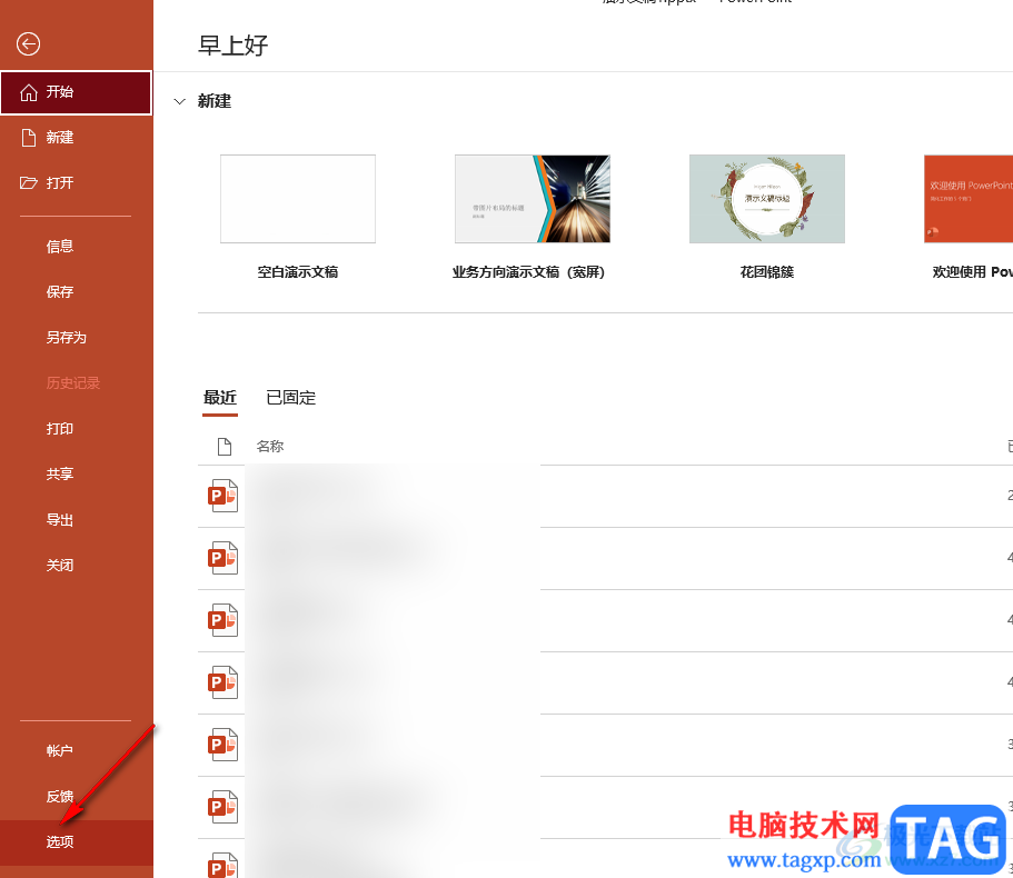 3、第三步,在“文件”页面中,我们在左侧列表的最下方找到“选项”,点击打开该选项