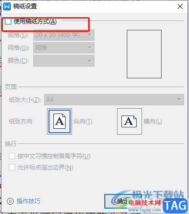 3.这时在打开的稿纸设置窗口中,用户需要勾选使用稿纸方式选项,下方相关的功能将会显示出来