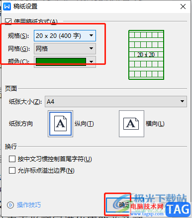 4.用户可以看到有规格、网格、颜色以及纸张大小方向等设置选项,用户直接跟着自己的需求来进行设置即可,之后按下确定按钮