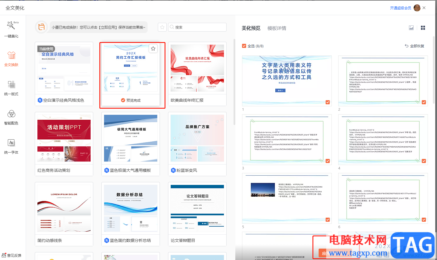 7.在打开全文美化窗口中,用户选择自己的喜欢的模板并按下应用美化即可,或是开通会员享受更多精美的模板