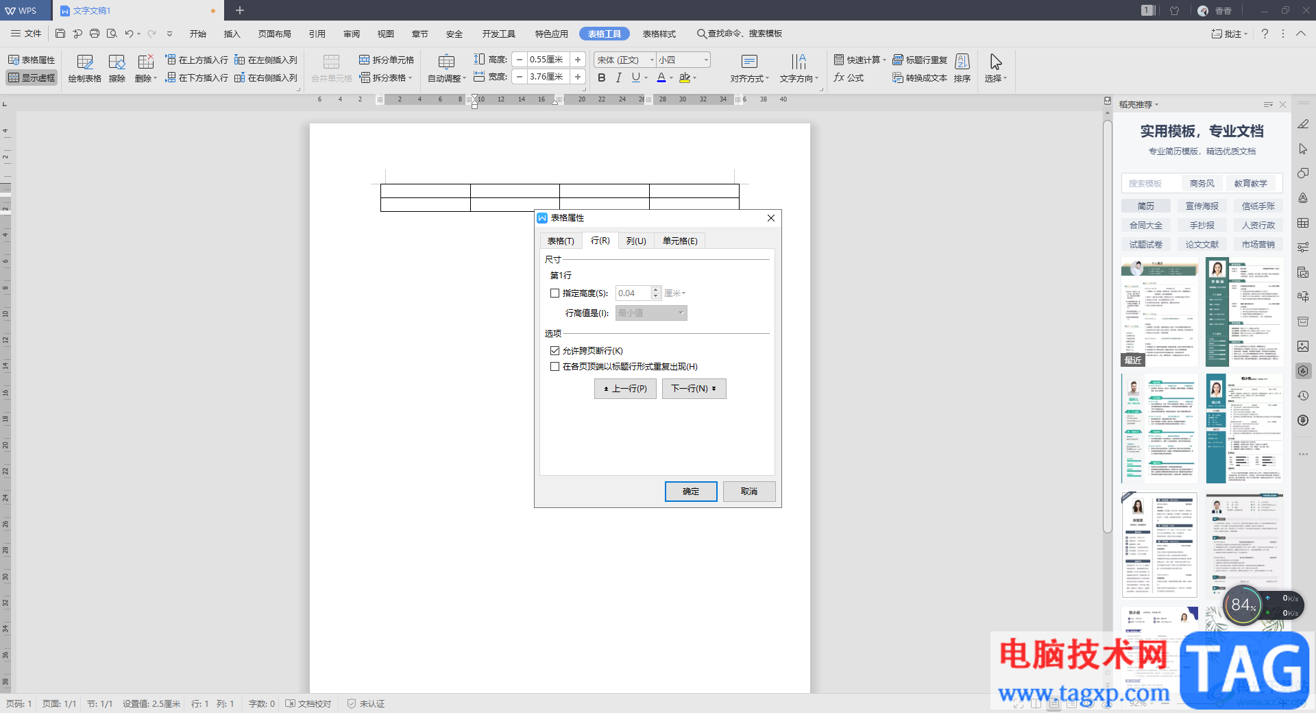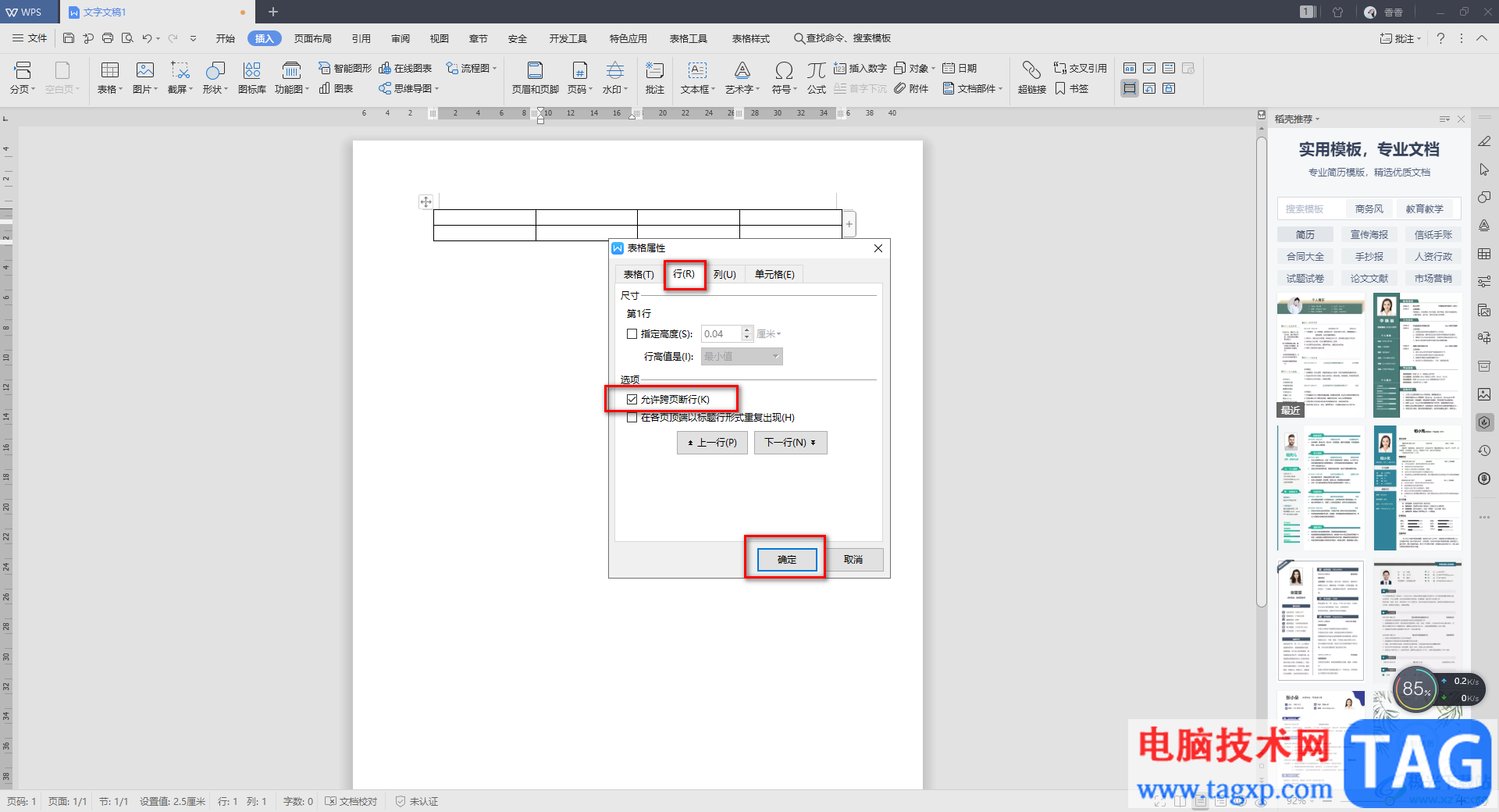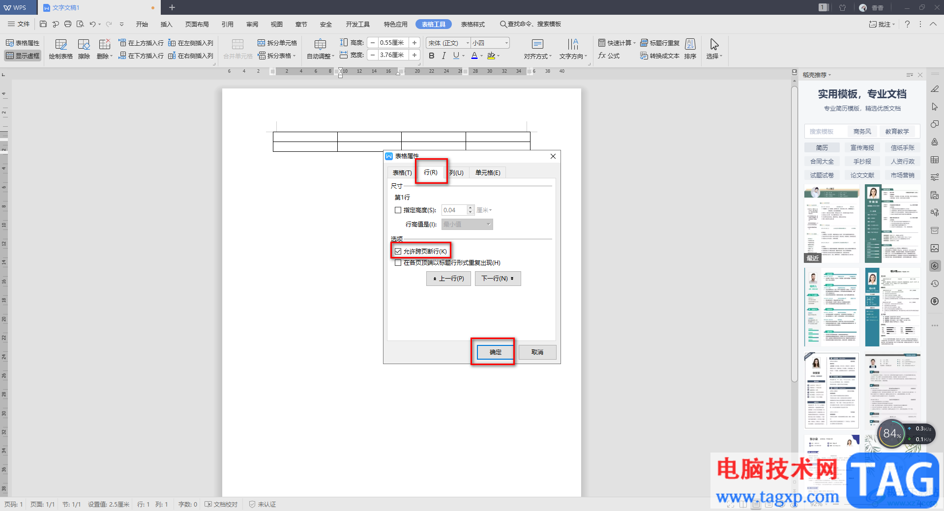 5.这里同样点击【行】这个选项卡,之后将【允许跨页断行】这个选项点击勾选就好了,如图所示。