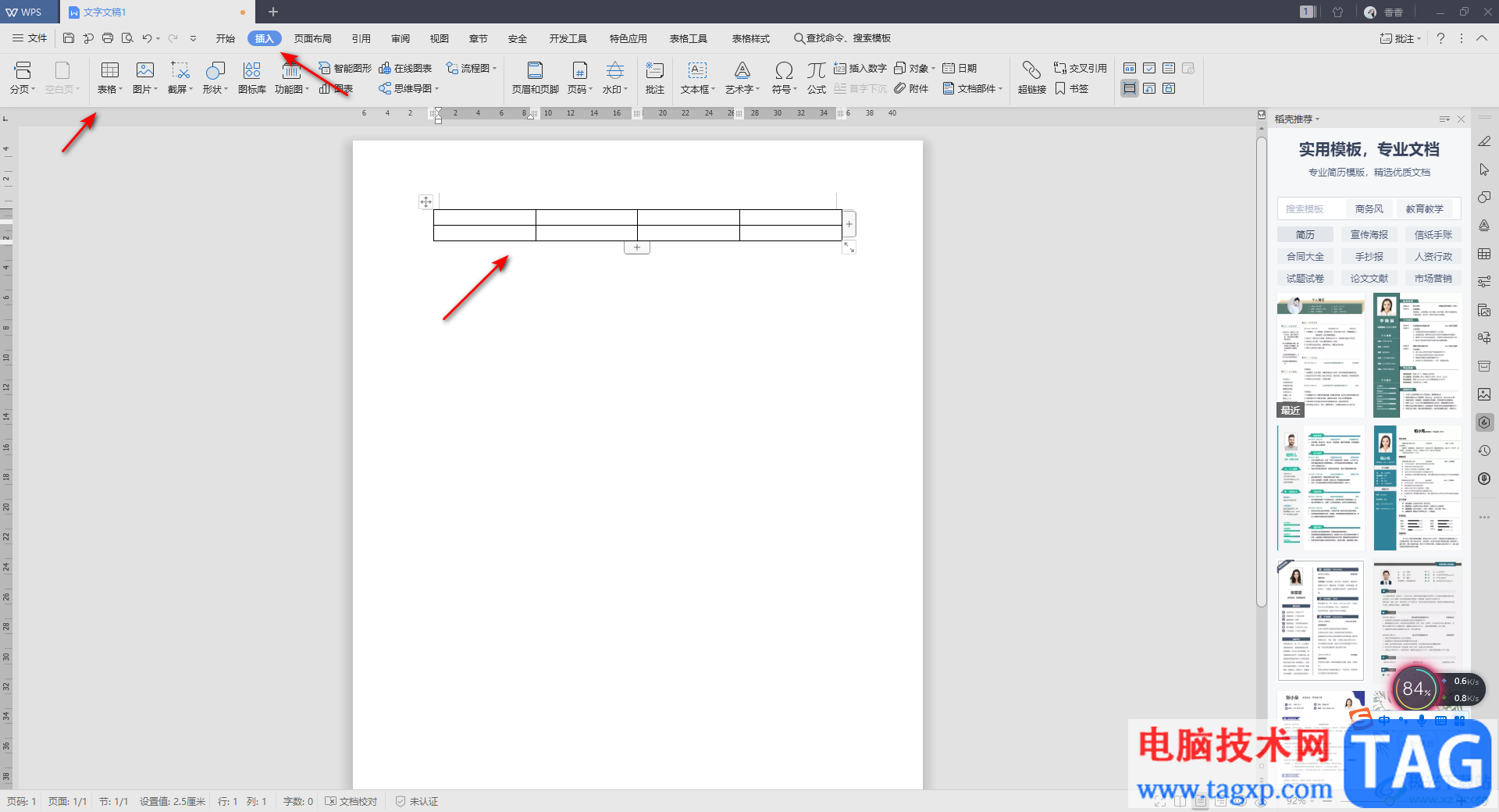1.首先我们需要在文档中插入一个表格,点击【插入】选项,然后在工具栏中将【表格】这个选项进行点击一下,用鼠标勾选自己想要的行数和列数,之后就会在文档中插入自己需要的一个表格。