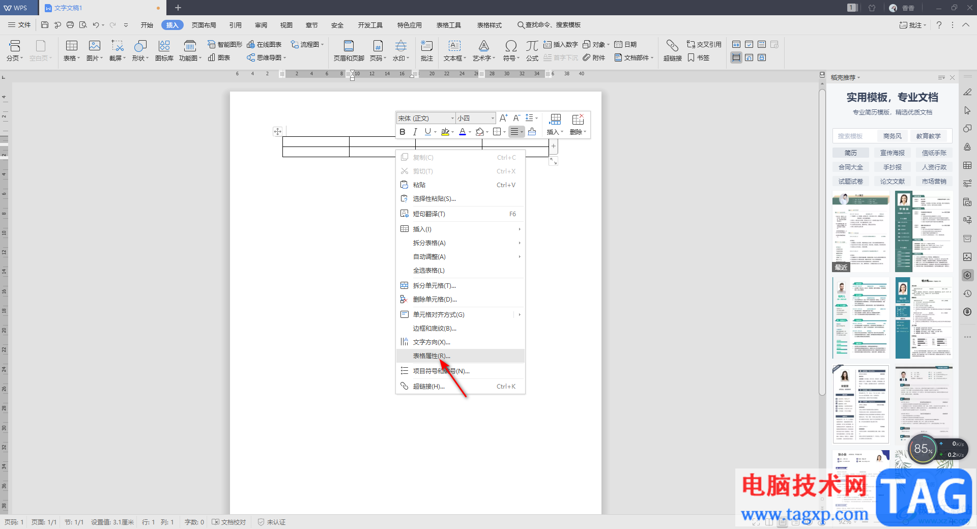 2.如果你想要让自己的表格进行跨行显示的话,那么你可以将表格进行右键点击选择【表格属性】。