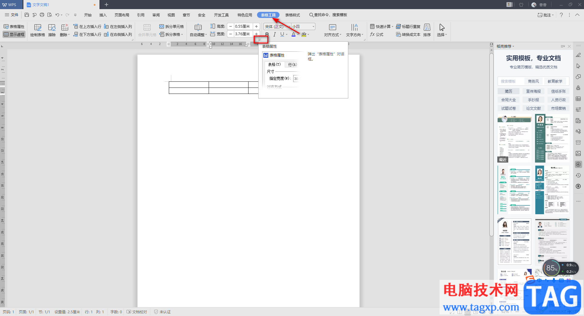 4.此外还有一种设置方式,你可以直接将鼠标移动到上方的【表格工具】的位置点击一下,然后在工具栏中的【宽度】右下角的位置,有一个扩展符号,我们点击该符号进入到操作页面中。