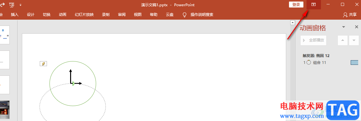 4、第四步,我们也可以在PPT的右上角找到“功能区显示”图标,点击打开该图标