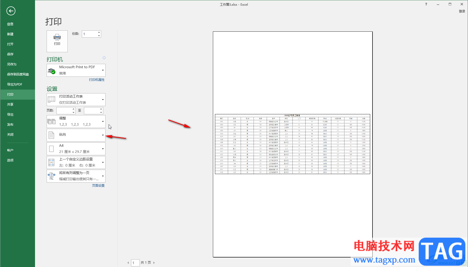 第二步:在新页面左侧点击“打印”,可以看到当前是纵向打印的效果;