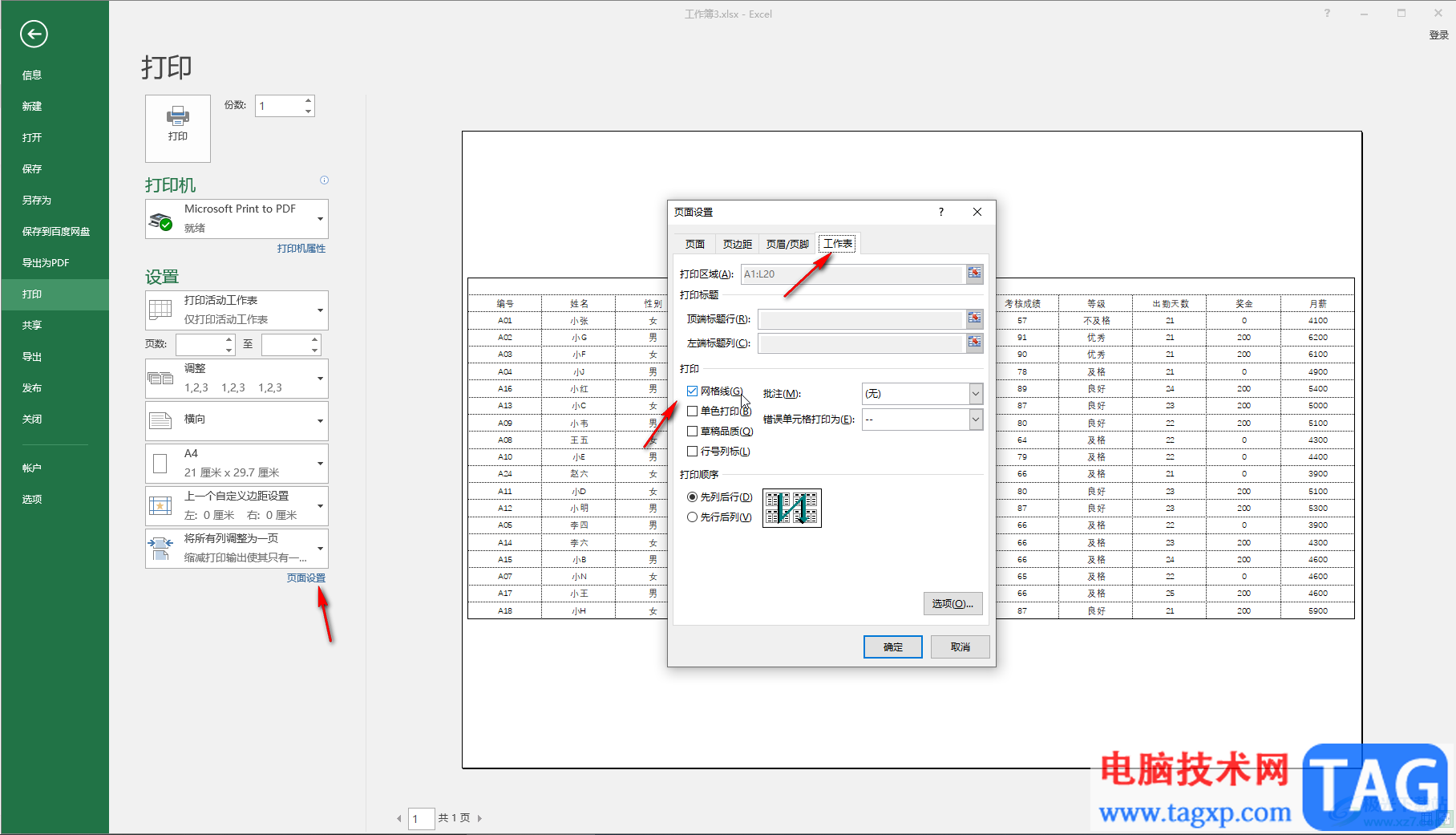 第四步:点击“页面设置”后还可以在打开的窗口中设置想要的打印参数,比如可以设置是否打印网格线等等;