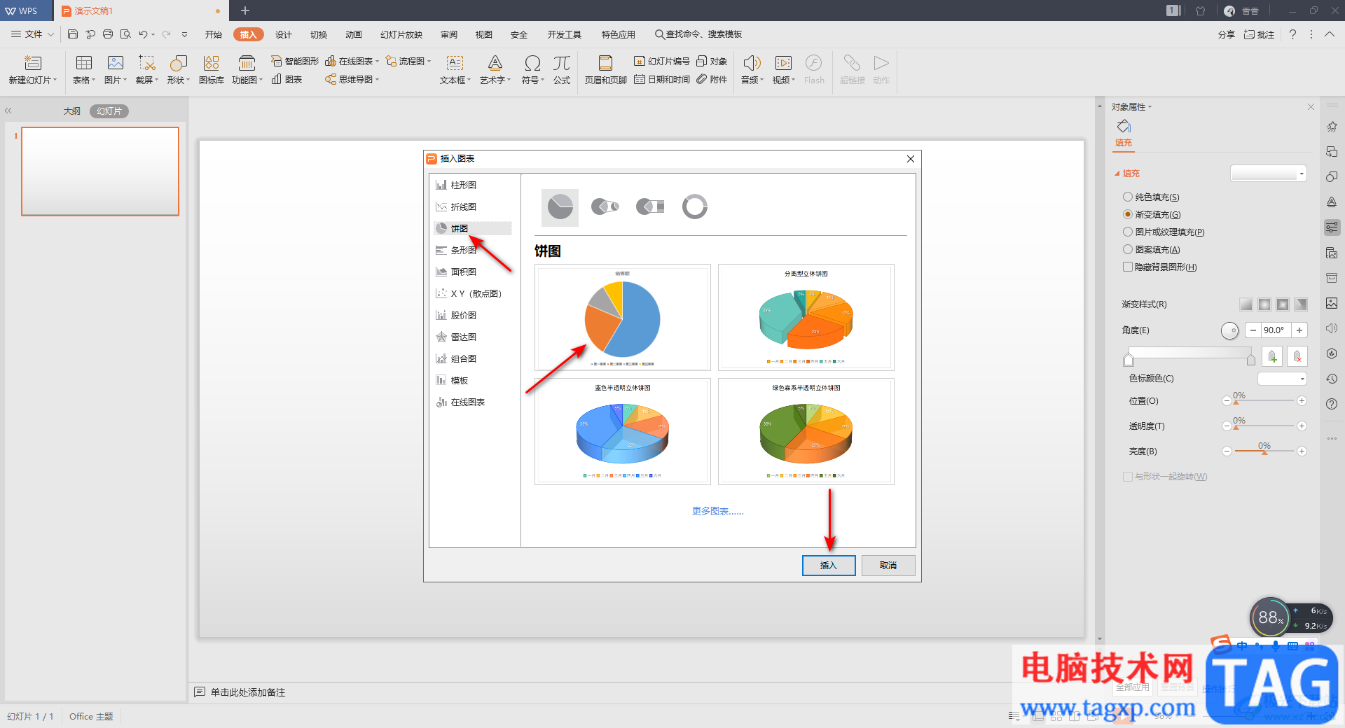2.在打开的窗口中,将我们需要插入的图表选中,之后点击右下角的【插入】按钮,将图表插入到自己的幻灯片页面中。