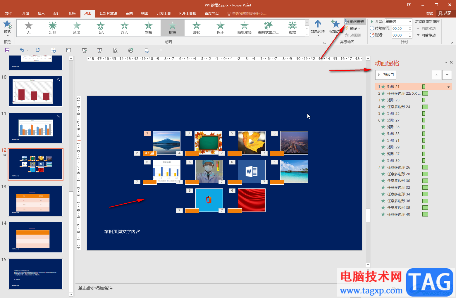 第四步:设置好动画效果后,点击“动画窗格”按钮打开侧边栏,可以看到添加的动画;