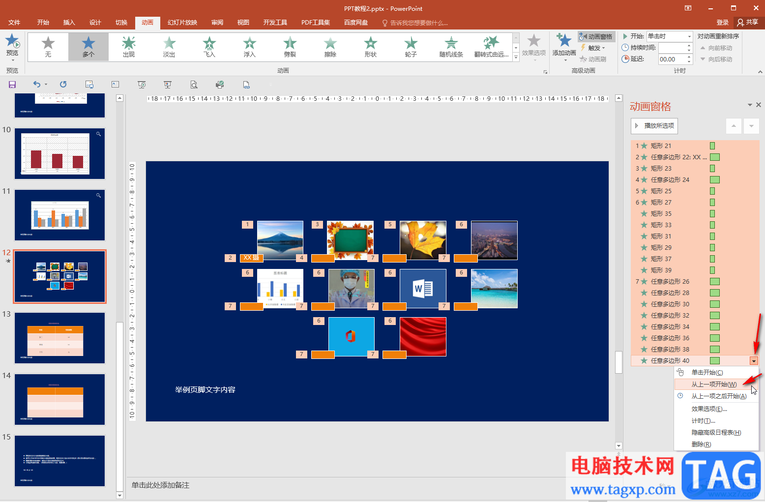 第五步:点击选中第一个动画效果后,按住shift键的同时点击最后一个动画效果,这样可以选中全部动画,然后点击下拉箭头后选择“从上一项开始”就可以了。
