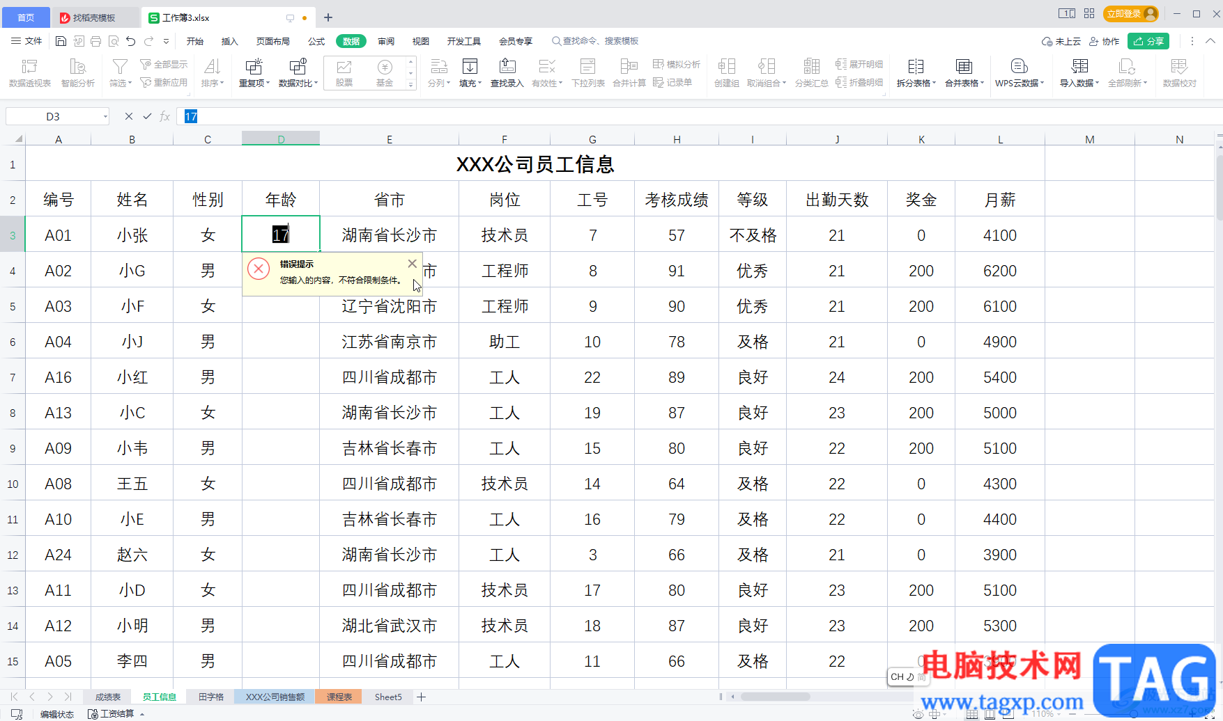 以上就是电脑版WPS表格中解决输入内容不符合限制条件的方法教程的全部内容了。另外,如果我们希望为单元格设置限制条件,就可以在数据选项卡中点击“有效性”后在窗口中进行设置了。