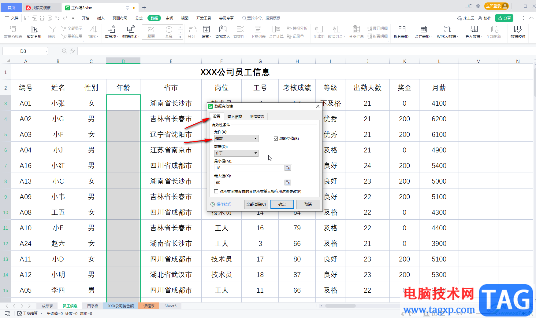 第三步:在打开的窗口中切换到“设置”栏后,可以看到当前只允许输入介于18到60之间的整数;