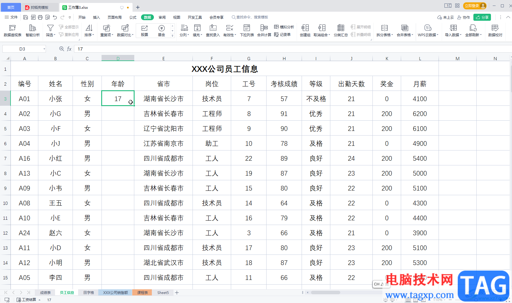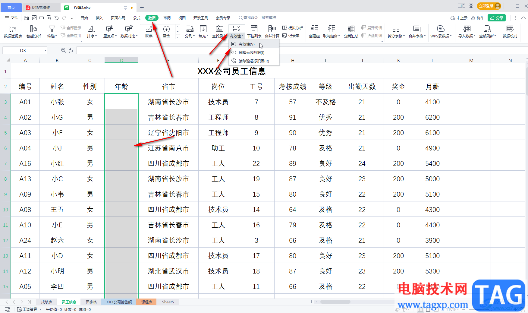 第二步:选中不能正常数简单表格区域,在“数据”选项卡中点击“有效性”,在子选项中继续点击“有效性”;