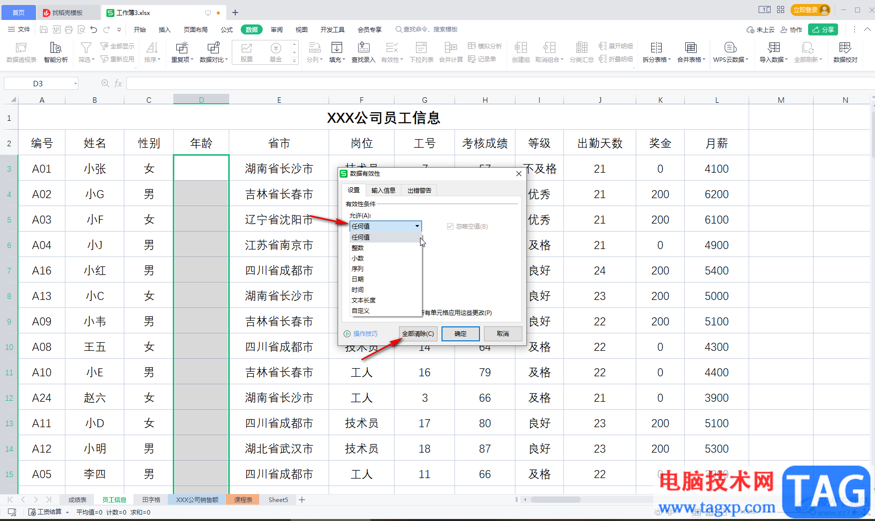 第四步:我们点击允许处的下拉箭头选择“任何值”或者点击“全部清除”,点击“确定”;