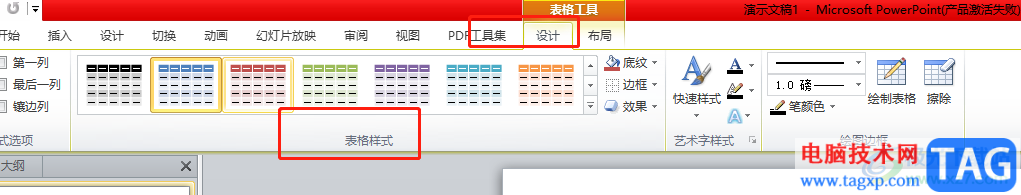 2.接着会在菜单栏中弹出表格工具选项,用户选择其中的设计选项,然后会在下方显示出选项卡,可以看到显示出来的表格样式板块