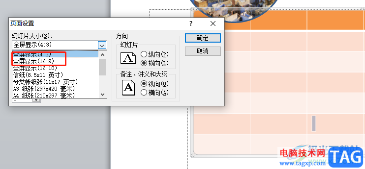 3.这时进入到页面设置窗口中,点击幻灯片大小选项右侧的下拉箭头,将会拓展出下拉选项