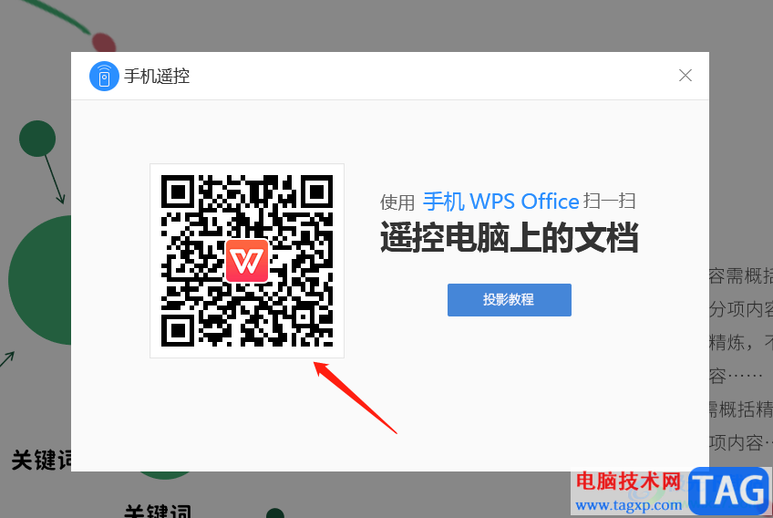 3.这时在页面上会弹出手机遥控窗口,可以看到窗口中显示出来的二维码,用户需要用手机上的wps软件来扫描