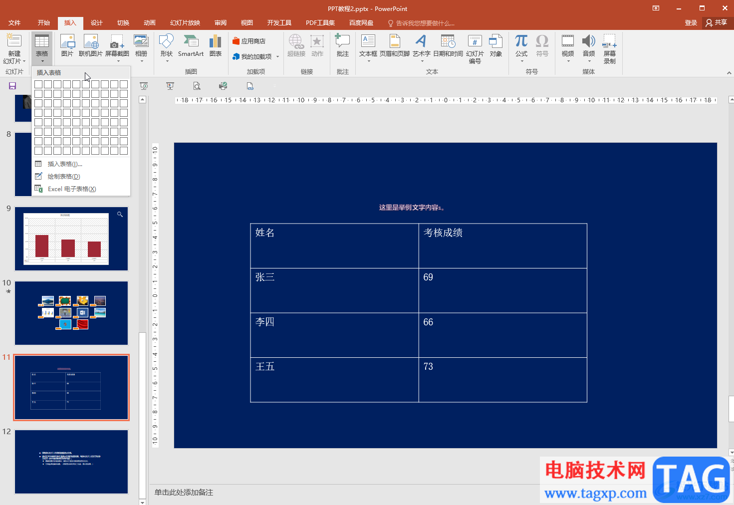第一步:双击打开PPT,在“插入”选项卡中点击“表格”按钮可以插入表格;