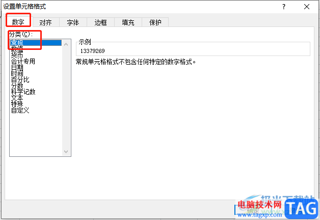 3.这时进入到设置单元格格式窗口中,用户在默认的数字选项卡中点击分类板块的常规选项