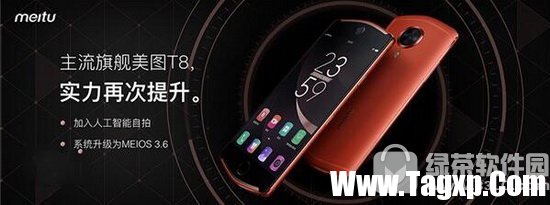 而升级版的美图T8加入了人工智能自拍技术,与刚刚发布的美图M8手机趋同。同时增加新色极光绿,至此美图T8有6种颜色可供选择,分别为:极光绿、魔力橙、耀目蓝、玫瑰金、宝石灰和幻影黑特别版。系统升级到MEIOS。