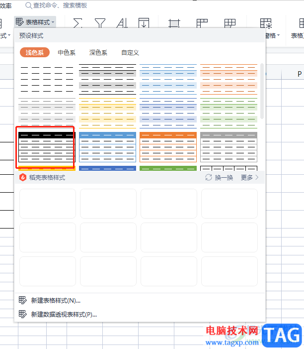 3.这时将会弹出表格样式的下拉选项,用户在预设样式板块中选择自己喜欢的表格样式