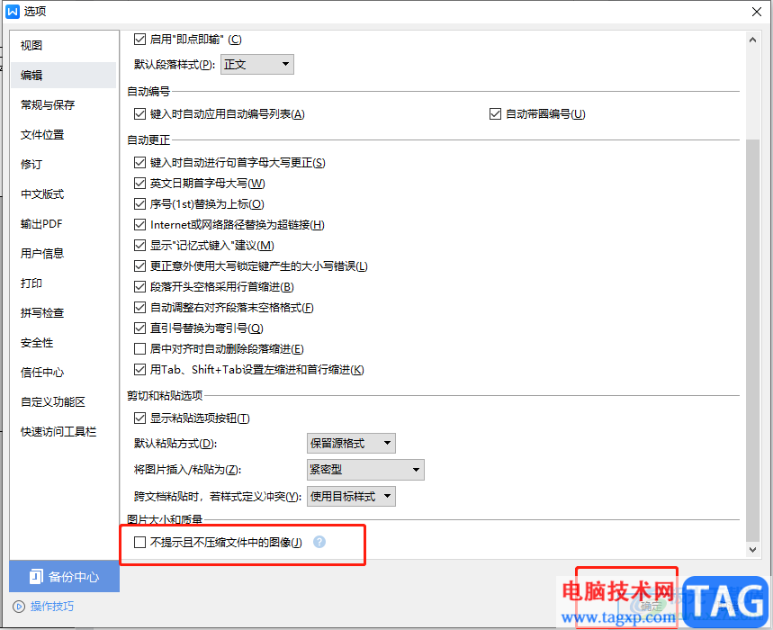 4.这时在右侧页面中,用户找到图片大小和质量板块并勾选其中的不提示且不压缩文件中的图像选项,然后按下确定按钮就可以了