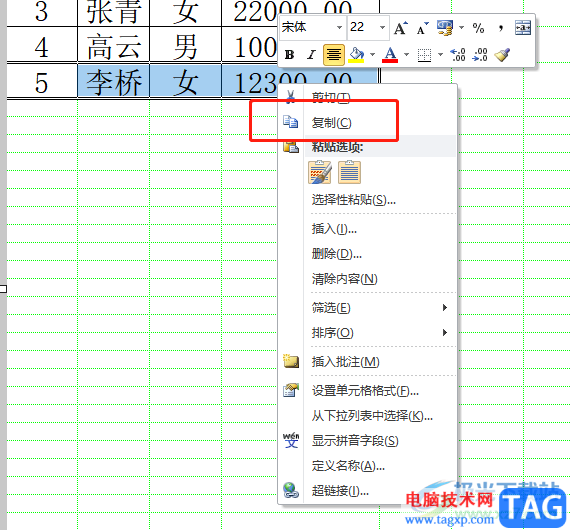 4.或者用户选中单元格并用鼠标右键点击,在弹出来的右键菜单中用户选择复制选项,还可以按下ctrl+c快捷键来复制