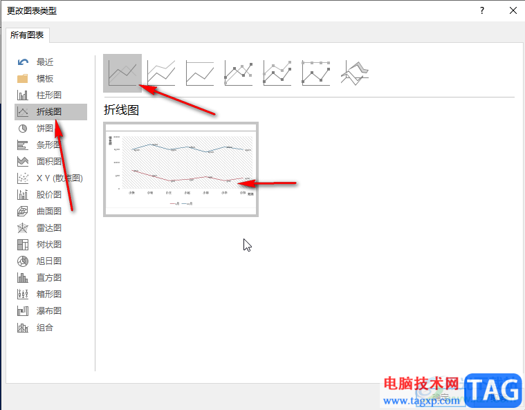 第四步:在打开的窗口中点击选择“折线图”,然后选择一个想要的折线图类型后点击折线图并进行确定;