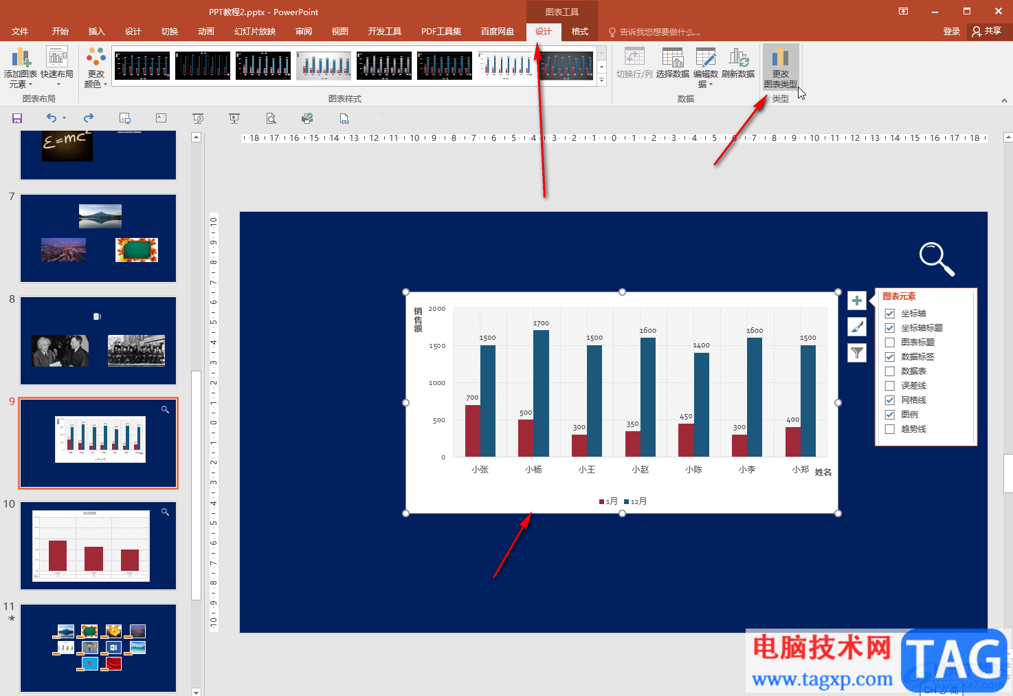 第二步:点击选中图表,在自动出现的“图表工具”下点击“设计”——“更改图表类型”;