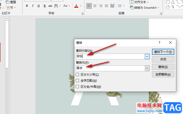 以上就是小编整理总结出的关于PPT查找替换文字的方法,我们在幻灯片中打开“替换”工具,然后在弹框中输入查找内容以及替换内容,最后点击“全部替换”选项即可,感兴趣的小伙伴快去试试吧。