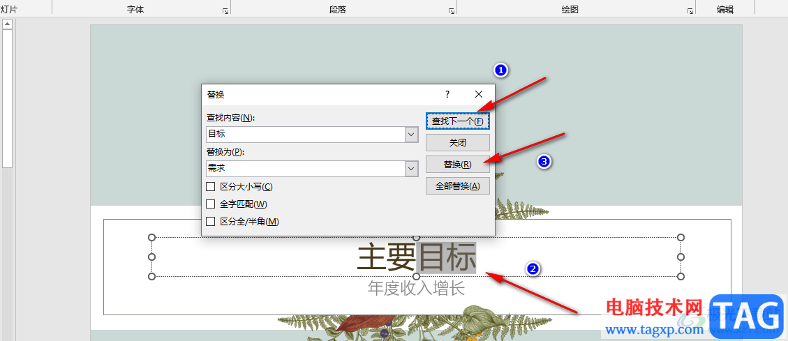 4、第四步,输入好查找以及替换内容之后,我们点击“查找下一个”选项,然后在幻灯片中就能看到查找的结果了,我们可以点击“替换”选项,替换当前查找到的单个内容
