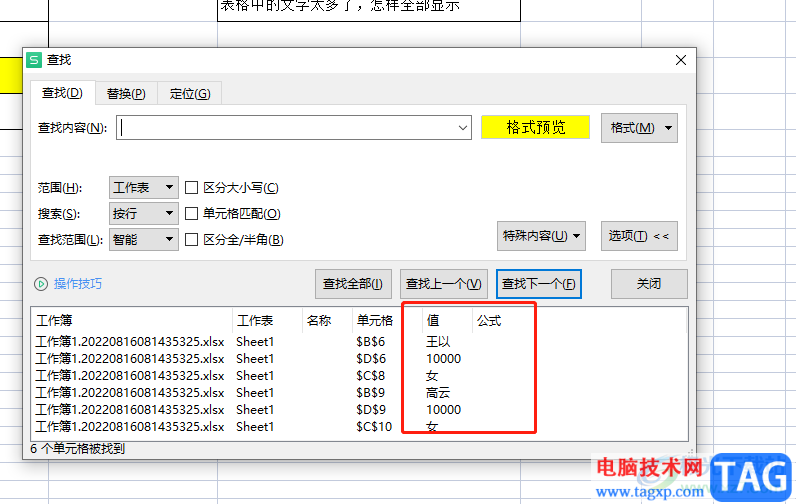 8.操作完成后,用户就可以在查找窗口下方看到统计好的表格同颜色单单元格格式了