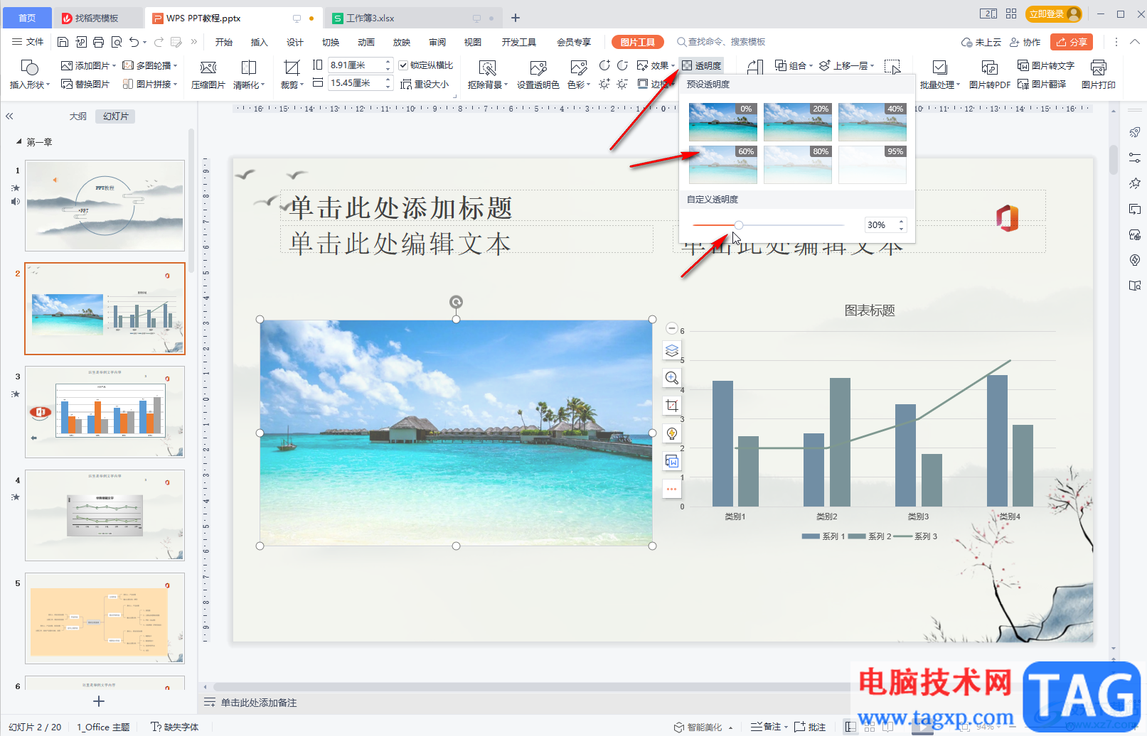 第三步:点击“图片工具”下的“透明度”,在子选项中可以选择已有的透明度效果,也可以自定义拖动调整;