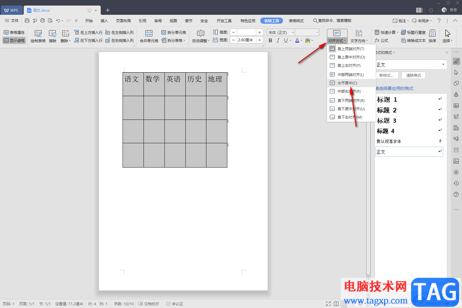 3.那么这个时候我们就可以在显示出来的工具栏中找到【对齐方式】,之后在对齐方式的下拉选项中,选择【水平居中】选项就好了。