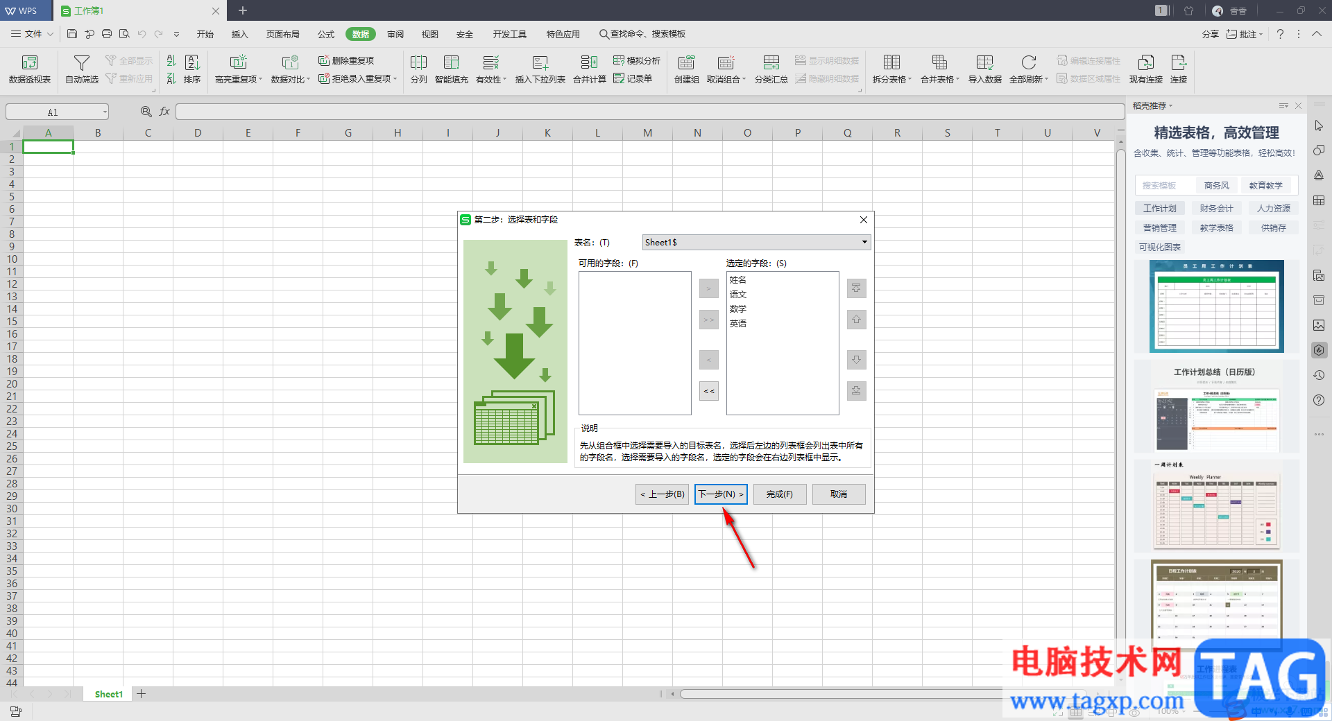 5.随后我们选中的数据就会体现在窗口中,你可以根据自己的需要将要导入的数据内容点击一下,然后再点击向右的箭头,将数据移动到右侧。