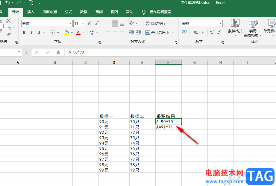 2、第二步,进入Excel页面之后,我们在该页面中点击一个目标单元格,然后在其中输入“A=90*70”,90和70是我们需要计算的数据,乘号图标在数据键盘上可以找到,我们将两个单元格的数据手动输入