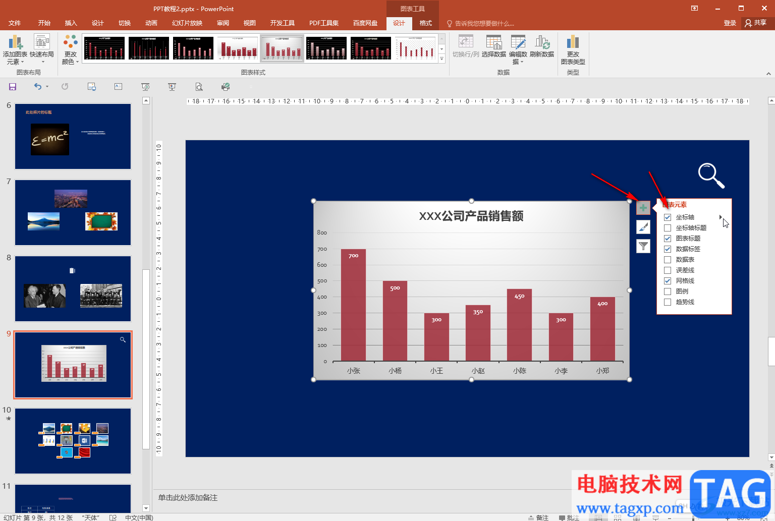 第四步:点击选中表格,然后点击右上方自动出现的加号图标,可以勾选或取消勾选图表元素;