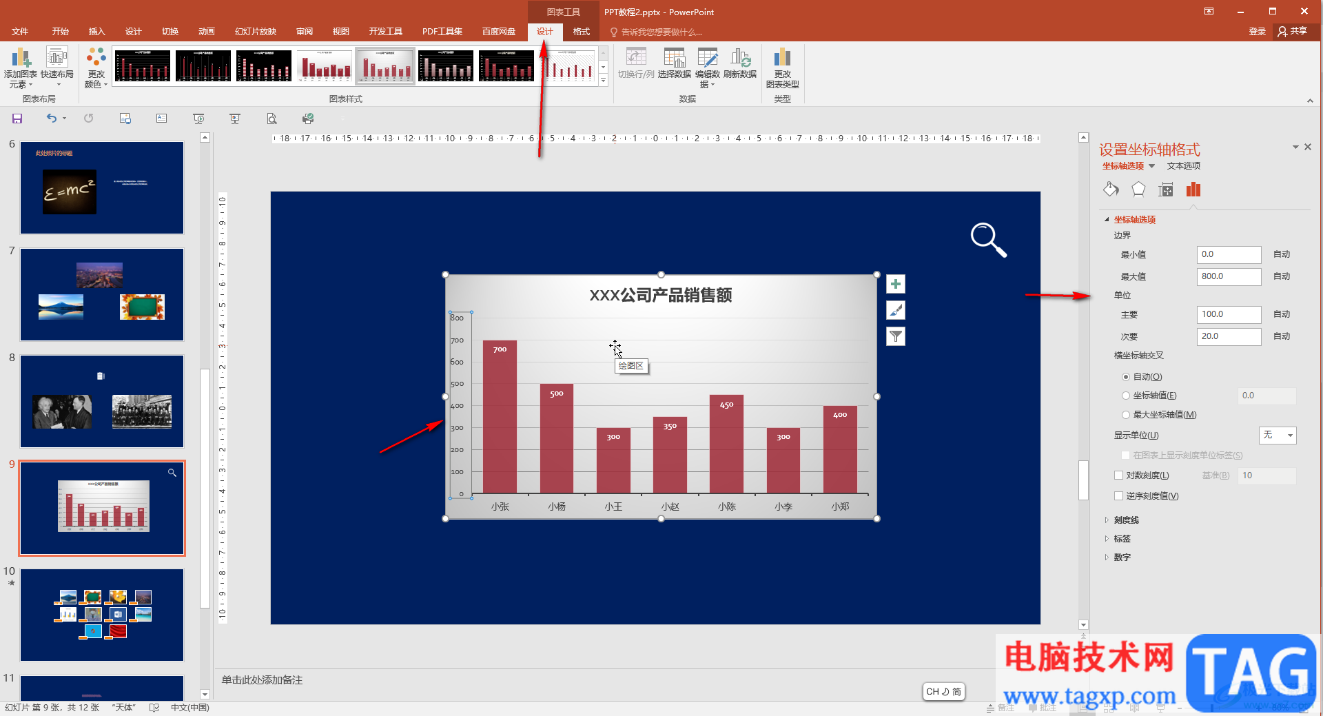 第五步:双击图表的坐标轴等,可以在打开的侧边栏中修改刻度值,在“图表工具”下可以点击切换到“设计”和“格式”栏进行详细的参数设置。