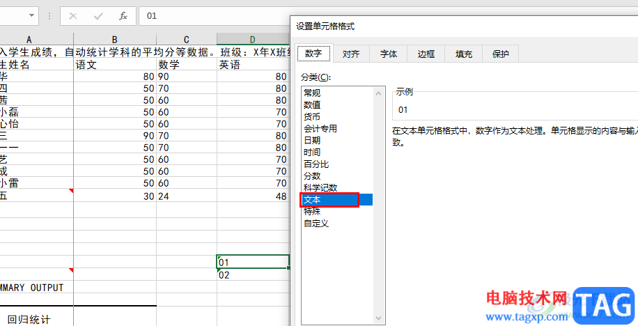 6、第六步,在设置单元格格式页面中,我们将分类改为“文本”,然后点击“确定”选项即可,改为文本选项之后,我们在单元格中输入“01”之类的数字也能正常显示了