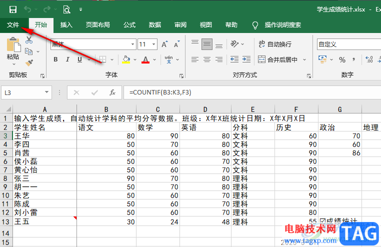 2、第二步,进入Excel页面之后,我们点击左上角的“文件”选项,进入文件页面