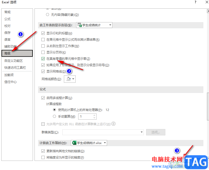 4、第四步,在选项页面中,我们先点击“高级”选项,然后在高级页面的“在此工作表的显示选项”下确认“在具有零值的单元格中显示零”处于被勾选状态,然后点击“确定”选项