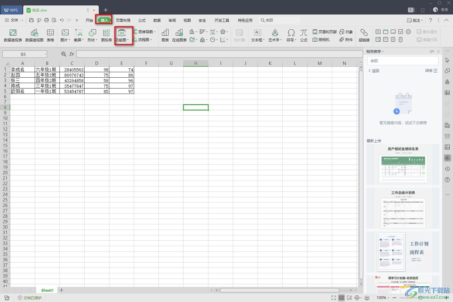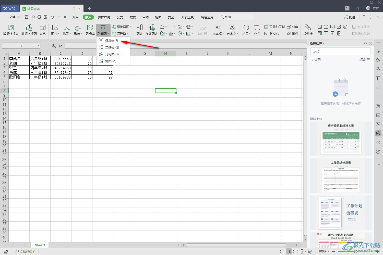 1.首先我们需要将鼠标定位到要插入条形码的单元格中,然后再将上方的【插入】选项进行点击,并且在工具栏中将【功能图】这个选项点击一下。